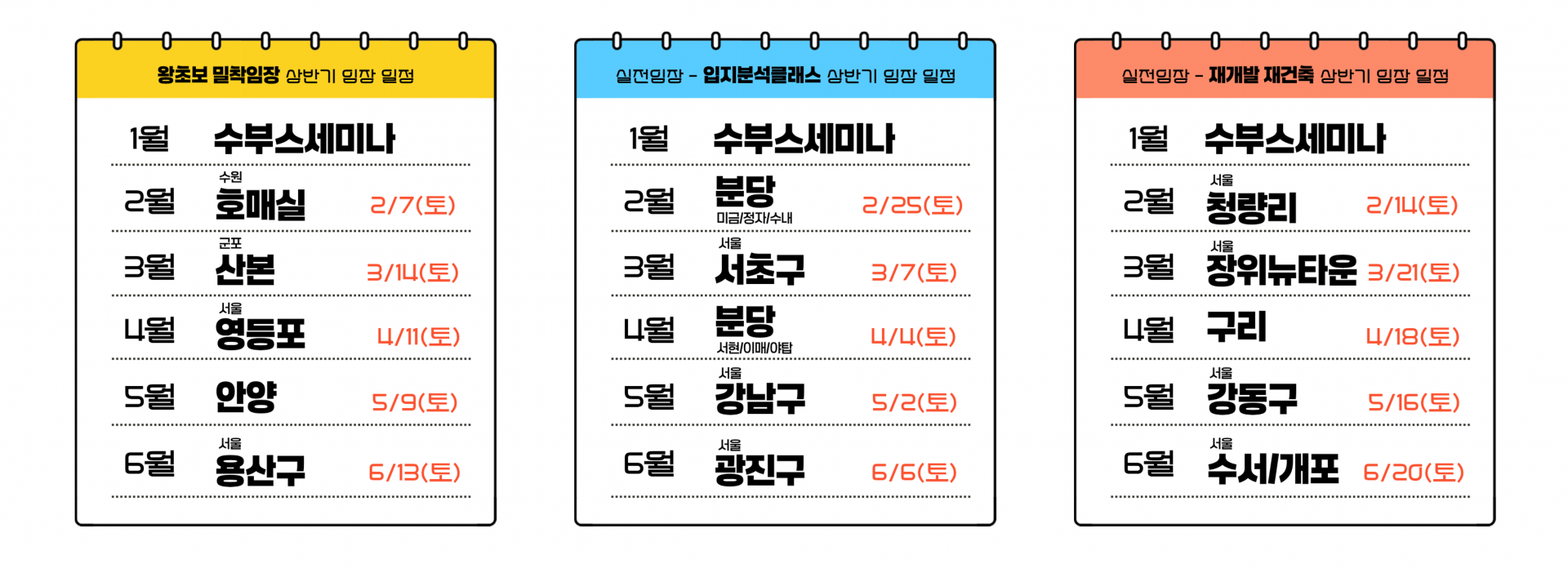 한 달 안에 3가지 임장 중 원하는 일정만 골라 자유롭게 참여할 수 있는 자유이용권형 패키지입니다.